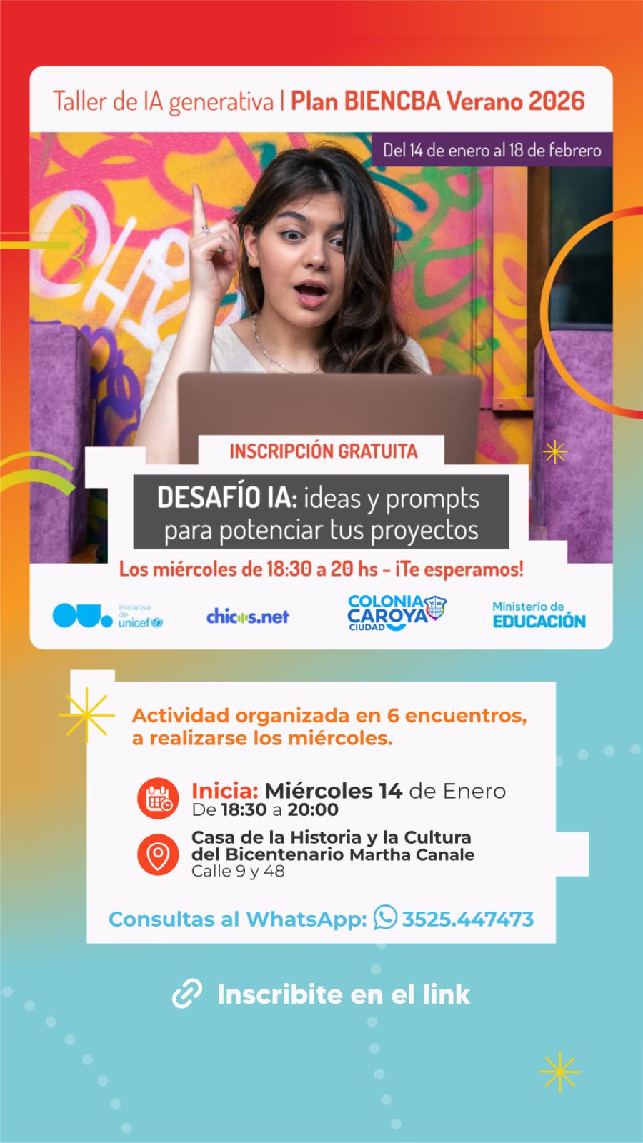 El Ministerio de Educación de la Provincia de Córdoba, junto a UNICEF y Chicos.Net, en el marco del Plan BIEN CBA Verano 2026, ofrecerá el dictado de un Taller de Inteligencia Artificial (IA) Generativa.