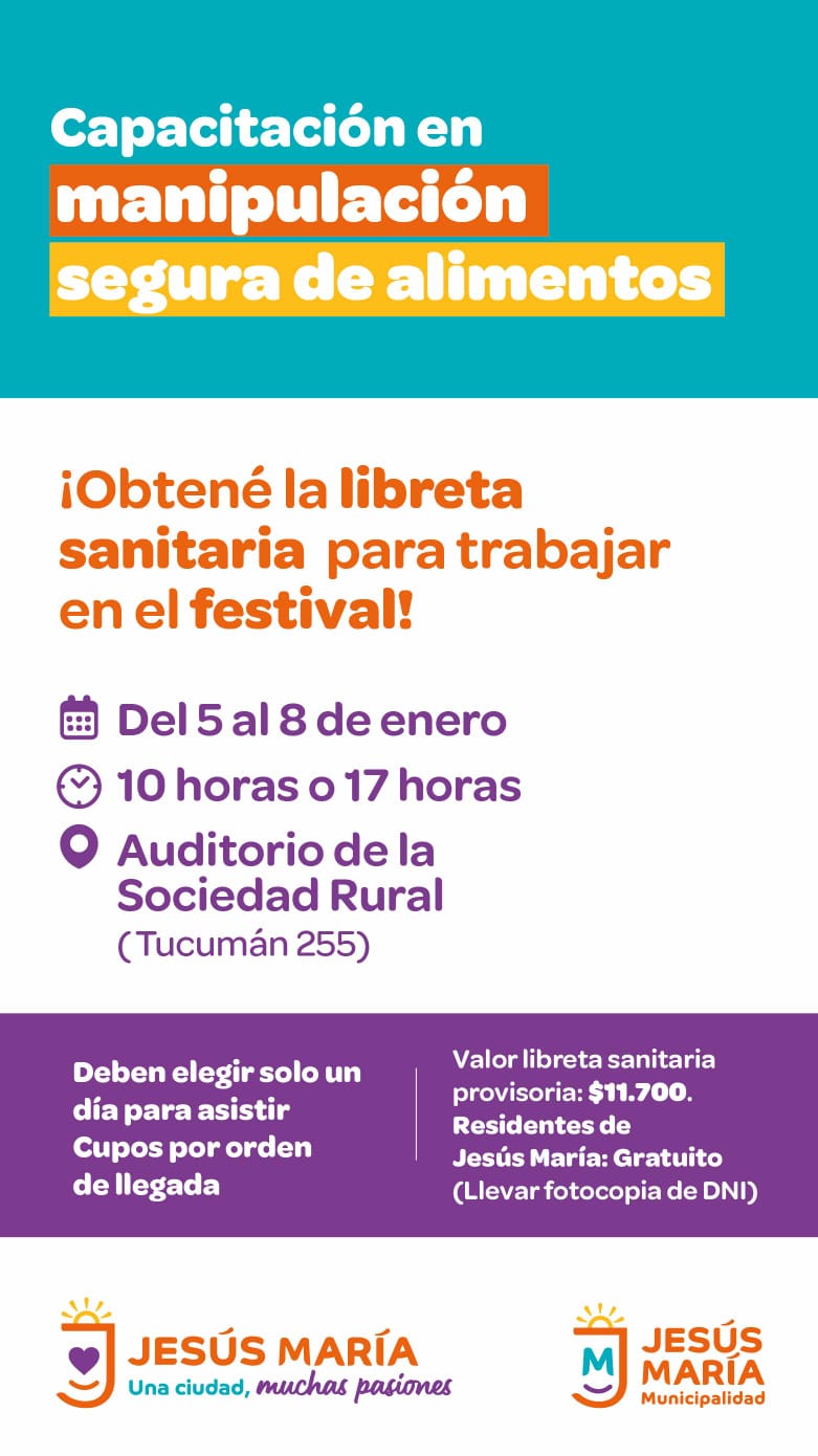 La Municipalidad de Jesús María convoca a manipuladores de alimentos que vayan a trabajar para la 60ma. Edición del Festival de Doma y Folklore, a los fines de realizar las capacitaciones anuales y obligatorias, para acceder a la libreta sanitaria provisoria.