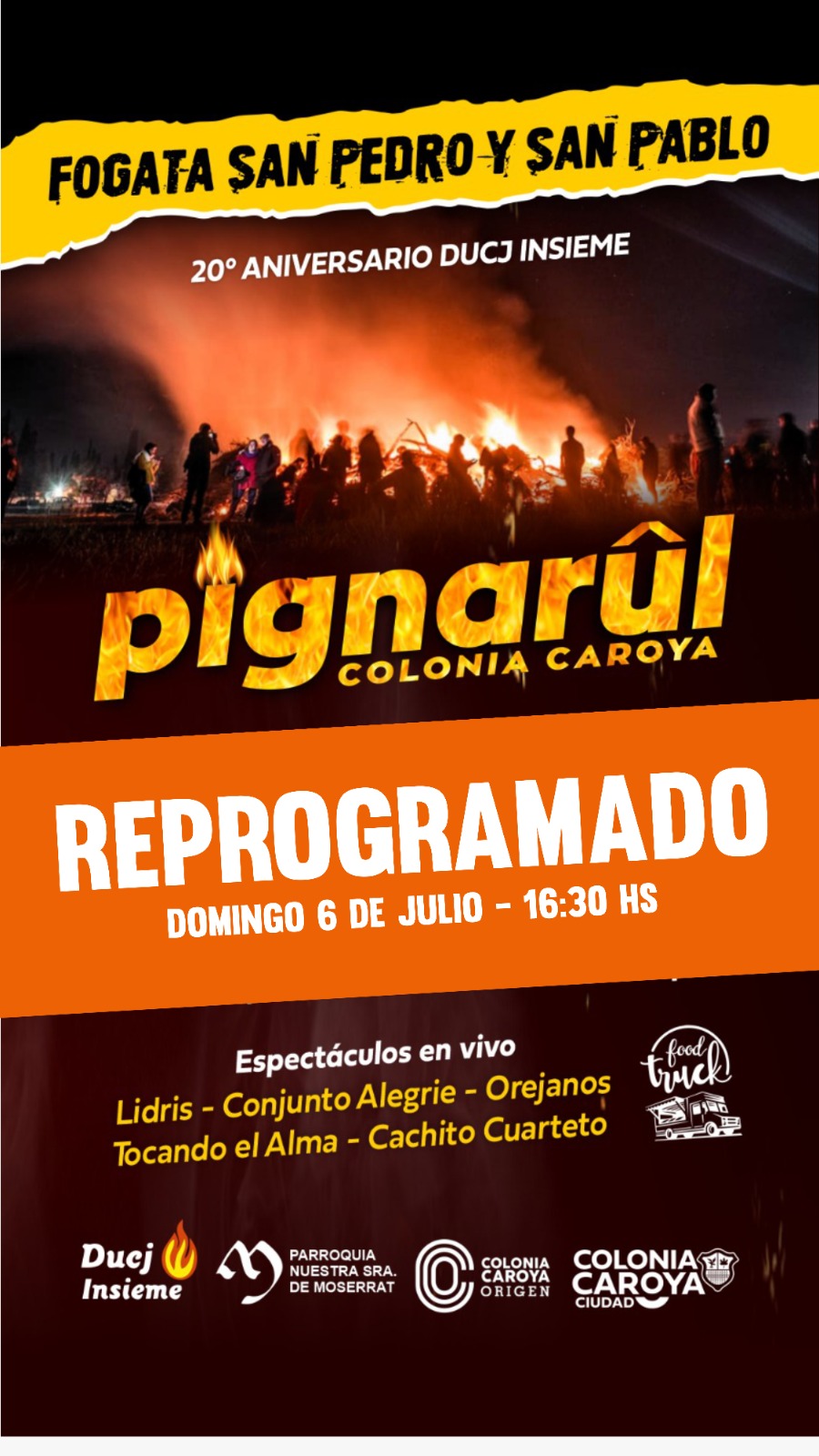 Atento a las condiciones climáticas y por recomendación de Defensa Civil de Colonia Caroya, la fiesta de San Pedro y San Pablo, con el encendido de la gran fogata, se reprograma para el domingo 6 de julio desde las 16:30, con el mismo formato y en el mismo lugar anunciado previamente.