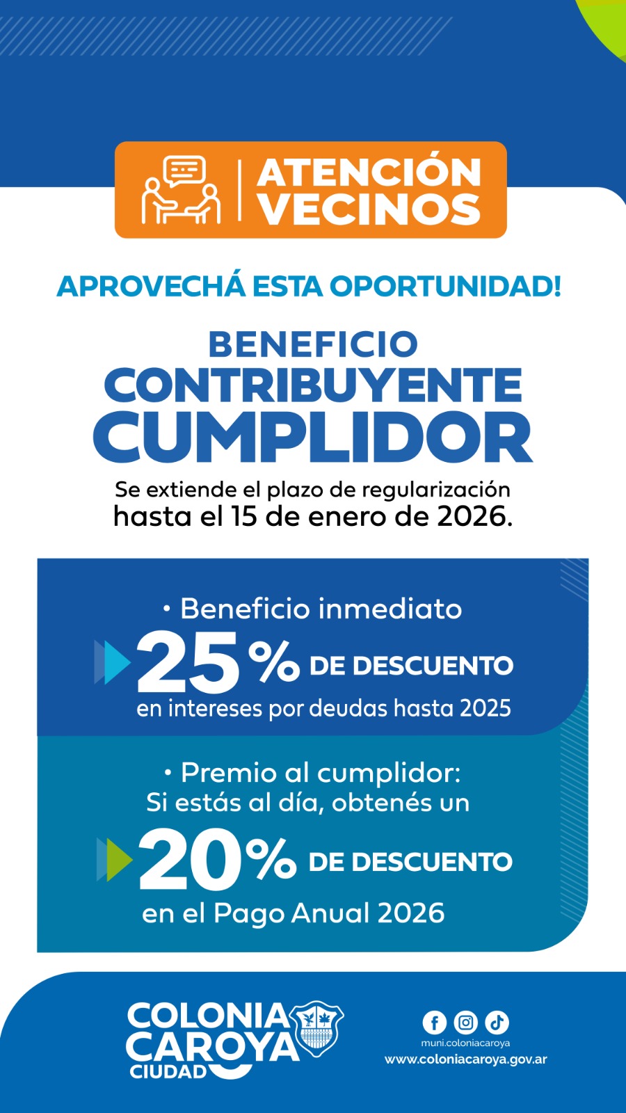 La Municipalidad de Colonia Caroya informa a la comunidad que extiende hasta el 15 de enero del 2026 el plazo para regularizar deuda en tasas municipales con el fin de permitirle a los vecinos acceder a los descuentos del “contribuyente cumplidor” en las tasas municipales del próximo año.
